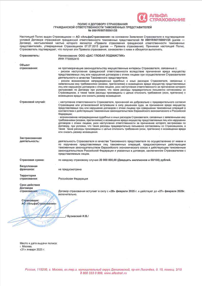 - Страховой полис (АО «АльфаСтрахование») № № 0991R/907/0000001/25 от 28 Февраля 2025 г. – страхование гражданской ответственности при осуществлении деятельности таможенных представителей.